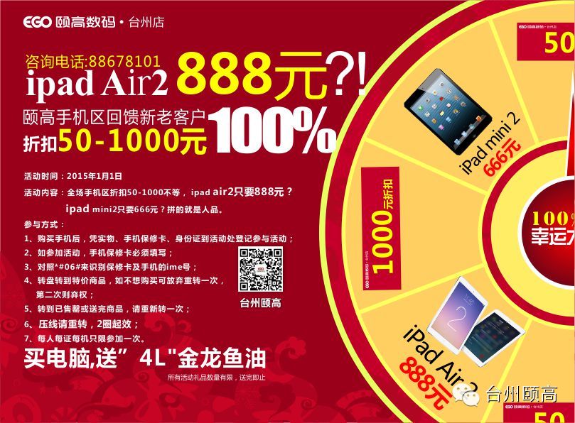 1月1日,全场手机区返你50-1000元不等, ipad air2只要888元? ipad mini2只要666元?返多返少,拼的就是人品。